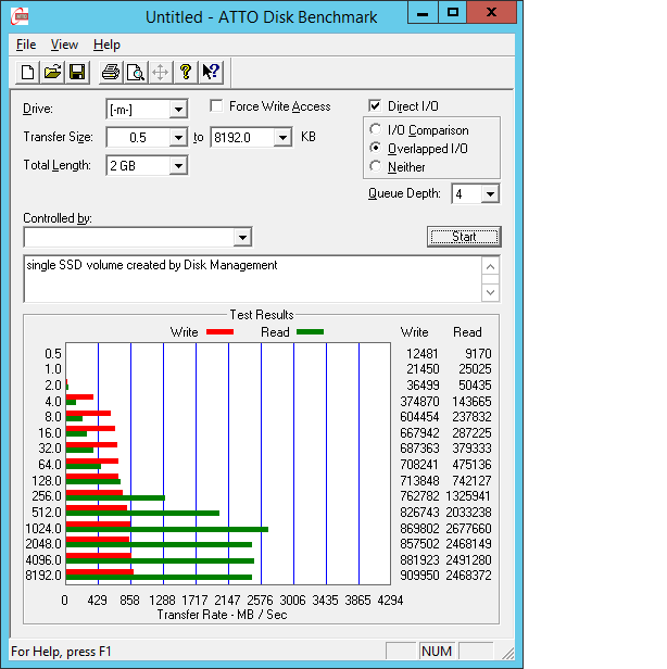 This is running Windows Server 2012R2 with all the latest patches. I've used both Storage Spaces / pools and traditional windows disk management to create a mirrored pair of these drives. I also tested a single drive by itself. The SS volume actually showed huge promise for a moment where it was obviously reading simultaneously from both drives. These are some of the fastest SSDs available now, so these results for just using a pair of them are pretty awesome. Using the old-school windows disk mirroring does show a performance penalty vs. a bare drive, but it's not drastic, so it's probably what I'll be forced to use unless I can fix the problem.